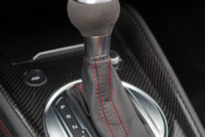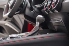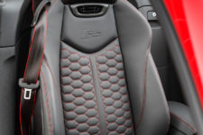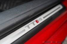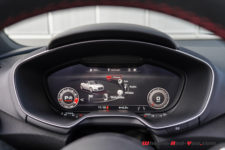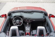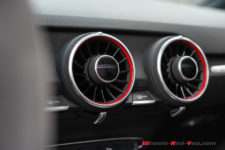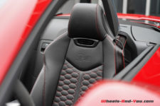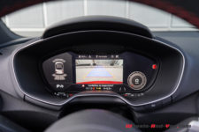 Je m’installe à bord et même si je ne suis pas fan de l’austérité des intérieurs de voitures allemandes, il faut admettre que leur rigueur garanti un véritable sentiment de qualité. C’est bien évidemment le cas pour cette TT-RS et heureusement, la configuration de notre auto bénéficie d’une finition un tantinet plus joyeuse que ce à quoi je m’attendais. En effet, grâce à différents éléments peints en rouge et surtout les surpiqûres, rouges également, notamment sur les sièges, le volant, etc., je découvre un habitacle très réussi avec un véritable esprit alliant sportivité et élégance.