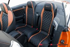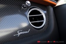 Tout comme l’extérieur, le cockpit de notre Bentley est impeccablement assemblé, tout de cuir, de carbone et de chrome. Le thème est bicolore. Du noir apporte classe et tact tandis que des éléments orange s’harmonisent avec la carrosserie jusque dans les moindres détails. Même la zone rouge du compte-tours est tracée de ce même orange, tout comme les informations distillées sur l’ordinateur de bord.