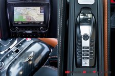 Au centre de cet intérieur trône une Breitling à aiguilles dont le brillant du cerclage est repris pour souligner les cadrans du tableau de bord, les pourtours des aérations et l’élégant pommeau de vitesses. Atteindre les comodos demande un petit effort d’adaptation, ils ne tombent pas naturellement sous les doigts car décalés vers le bas. C’est pour faire place aux palettes de changements de vitesses fixes et très ergonomiques. A contrario, le levier de vitesses central se manie « à l’envers », on monte les rapports en le poussant et l’on rétrograde en le tirant vers soi. Comme quoi, le raffinement n’empêche pas certaines bourdes.