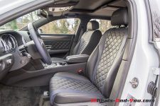 La finition de notre modèle d’essai, majoritairement de noir vêtu, contraste bien avec la teinte “Ice” de la carrosserie. Le motif façon “Chesterfield”, couvrant les sièges avant comme arrière ainsi que les panneaux de portes, offre un sentiment “salon” du plus bel effet. Les inserts en fibres de carbone coiffant la boîte à gants et les portières garantissent la note sportive de l’habitacle. Enfin, de petites touches “Bleu Impérial”, sur les sièges et le volant, viennent rompre l’allure monochrome de l’ensemble.