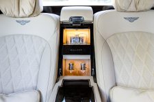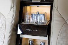 Au-delà des innombrables réglages des sièges à l’arrière, la voiture est également équipée d’un bar signé Mulliner dans l’accoudoir central, avec verres en cristal. Autre élément qui produit son effet : la partie haute du bar s’avance via un petit moteur électrique pour faciliter encore la saisie des verres… une option « offerte » pour EUR 8’225.-.