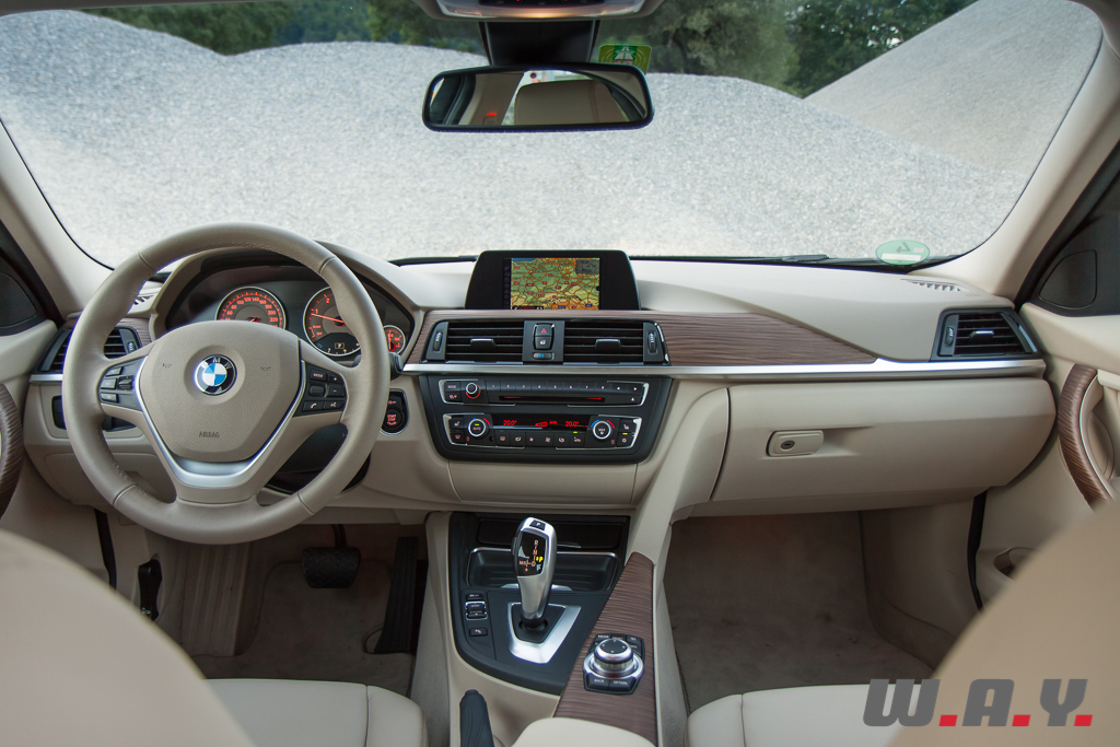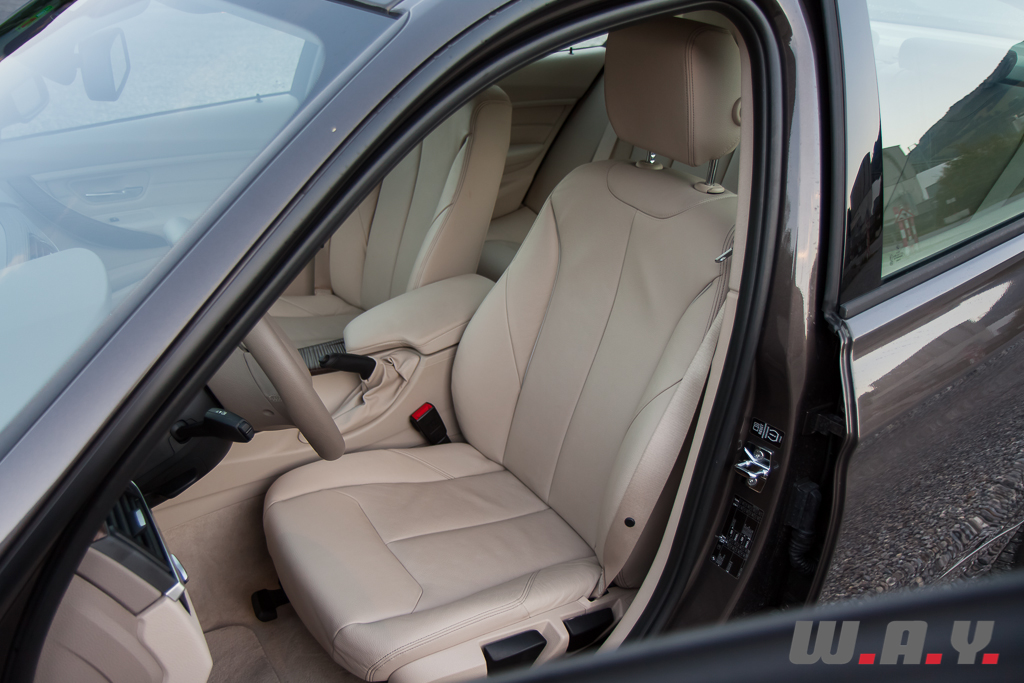 Continuant sur la lancée de la Série 5, l’intérieur de la Série 3 s’améliore lui aussi tant dans le choix et la qualité des matériaux que dans l’assemblage, mais la Bavaroise marque encore le pas vis-à-vis d’une Audi. L’agencement reste fidèle aux canons de la marque, soit un combiné d’instruments sobre et ultra-lisible destiné au pilote et une console centrale légèrement orientée vers lui. Je regrette par contre l’abandon de la double casquette de la planche de bord ; l’énorme écran du GPS est désormais posé au sommet de la console, à la façon d’un accessoire monté en seconde monte. Vu le prix de l’engin (CHF 2’190.-) c’est un peu léger, alors qu’il aurait été assez simple de s’inspirer de la grande sœur et intégrer l’appareil avec un peu plus de rigueur voire imaginer un dispositif d’écran rétractable…