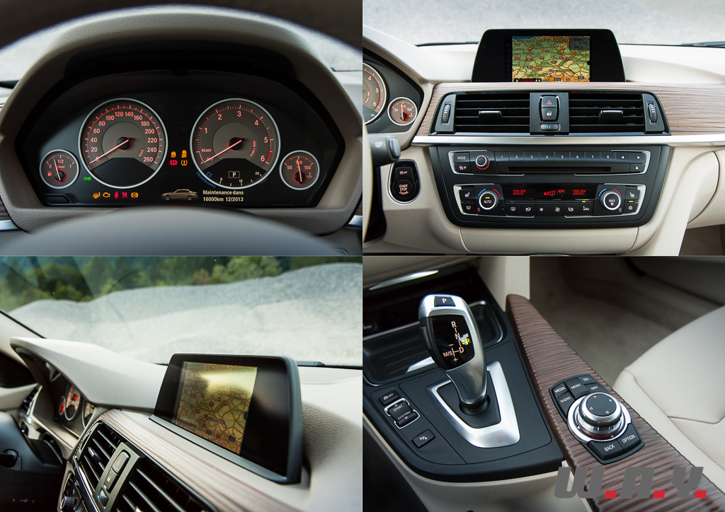 Continuons dans l’esthétique discutable : plusieurs niveaux de finition et d’équipements jalonnent le catalogue BMW. Notre modèle d’essai dispose du second niveau, « Modern », dans lequel il est possible d’opter pour des inserts en bois précieux « Fineline Pure Clair » dont la texture rappelle tout sauf du mobilier de luxe. Enfin, sans m’étendre sur les goûts de chacun quant à la sellerie, les coloris clairs sont très sensibles aux salissures et provoquent nombre de reflets dans les parties vitrées, notamment le pare-brise. A proscrire, donc. L’ergonomie générale est correcte et l’interface multimédia se pilotant au moyen du joystick sur le tunnel central s’apprivoise sans peine.
