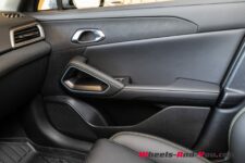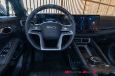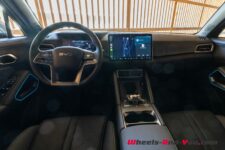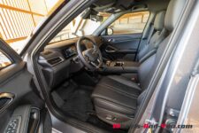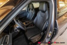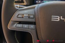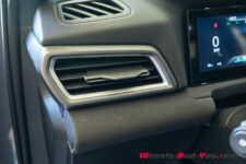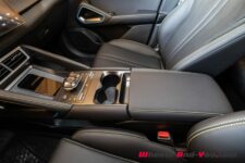 L’intérieur est basique mais on peut tout de même signaler des sièges revêtus de similicuir, avec des surpiqures de couleur contrastante pour leur donner un aspect plus élégant. L’accoudoir central, les poignées de portes et une partie des panneaux latéraux sont également recouverts de similicuir. Une discrète ligne LED souligne les poignées de portes. Ces éléments exceptés, le plastique à structure grossière règne en maître, y-compris pour les tapis de sol.