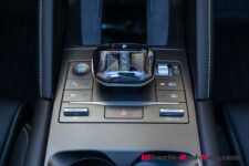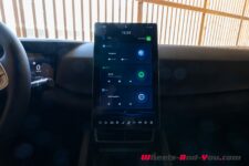 Le volant comprend les classiques réglages du régulateur de vitesse à gauche et du système audio à droite : volume, prise d’appel, microphone et sélection des sources. Sur l’écran principal, le software propose toutes les fonctions courantes. Les menus sont faciles à comprendre mais sont assez touffus, avec de très nombreuses possibilités offertes. La sélection de la marche avant ou arrière s’effectue via un joli levier à facettes sur la console centrale. On y trouve également le bouton de démarrage ainsi que le sélecteur de mode de conduite : Eco, Normal ou Sport.