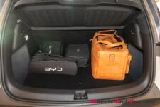 Je m’installe à bord et mes premières impressions sont plutôt mitigées : beaucoup de plastique, la petite note de couleur avec les surpiqures me donne l’impression que BYD fait un effort pour égayer un habitacle qui demeure toutefois très gris et noir. Le contraste entre une bonne qualité de construction et des matériaux bon marchés est surprenant.