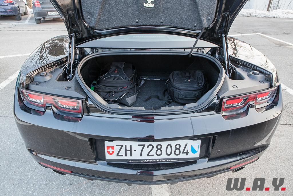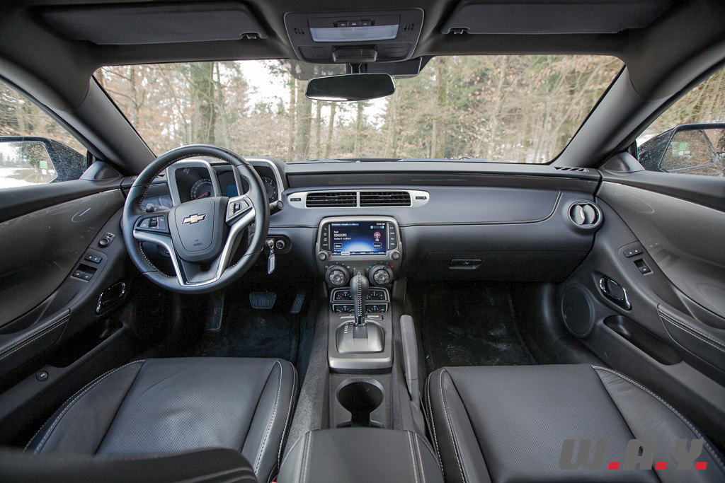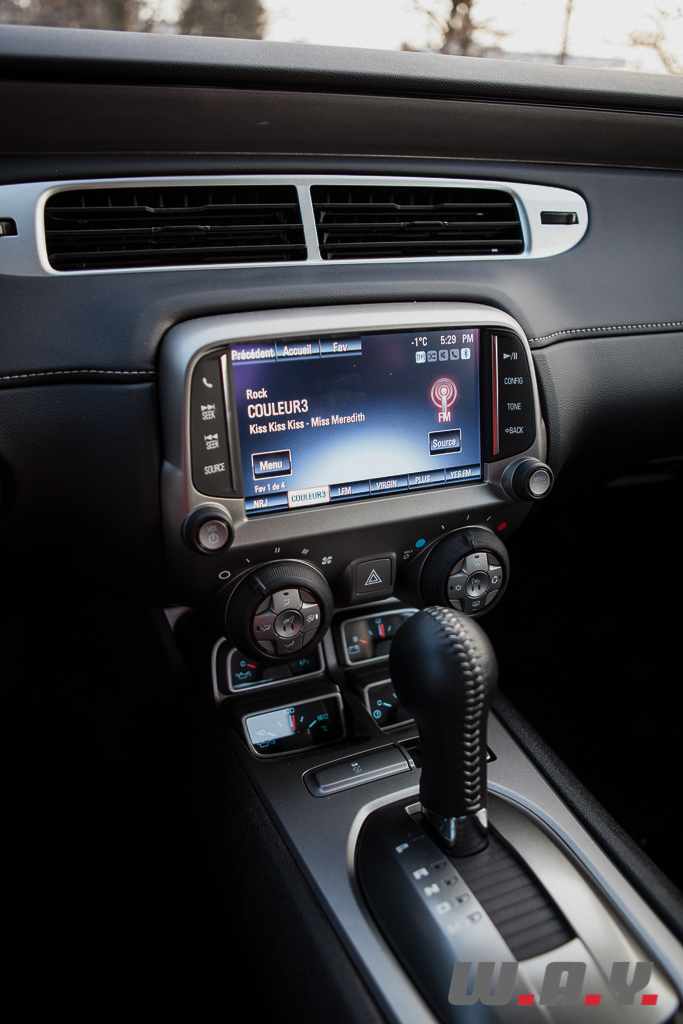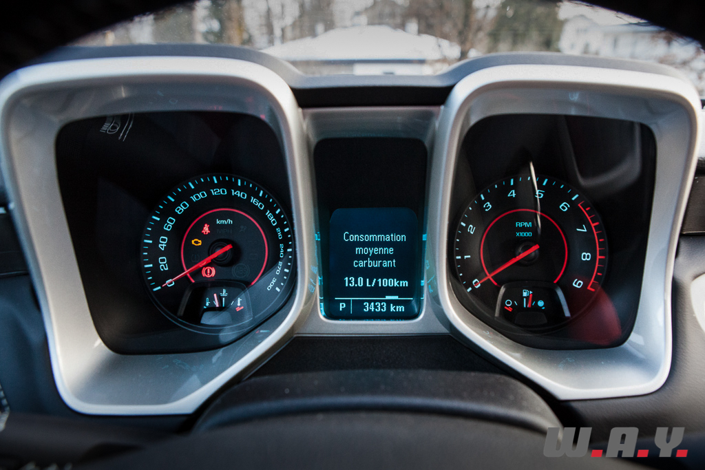 Dans l’ensemble, les sièges offrent une bonne assise même si pour une voiture typée sport on est encore loin d’un baquet. Mais le cuir est d’assez bonne facture. La qualité d’assemblage est en hausse par rapport aux premiers véhicules importés mais reste tout juste suffisante vis-à-vis des standards européens. Enfin, le coffre offre un espace appréciable de 384 litres même s’il n’est pas facilement accessible à cause d’une ouverture étriquée… et puis les sièges arrière se rabattent d’une pièce ce qui laisse la possibilité d’embarquer des skis (pas si fou que ça d’aller skier en Camaro) ou autres.