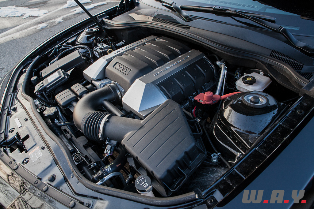 Bien entendu, c’est là que se trouve tout l’ADN de cette voiture qui, avec la boîte automatique, est livrée munie du bloc moteur baptisé L99 (LS3 pour la version manuelle). A plus d’un titre, ce moulin apporte un lot important de nouveautés pour du Made in U.S.A. ; mais avant de plonger dans les détails, il faut déjà parler de son pedigrée et ça commence avec la taille ! Complètement délirant sur nos terres, le moteur s’articule autour de 8 cylindres en V d’une cylindrée totale de 6.2 litres. Il offre une puissance de 405 CV (30 de moins qu’avec la boîte manuelle) à 5’900 t/min ainsi qu’un couple impressionnant de 556 Nm à 4’300 t/min.