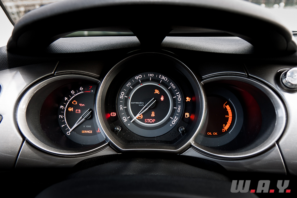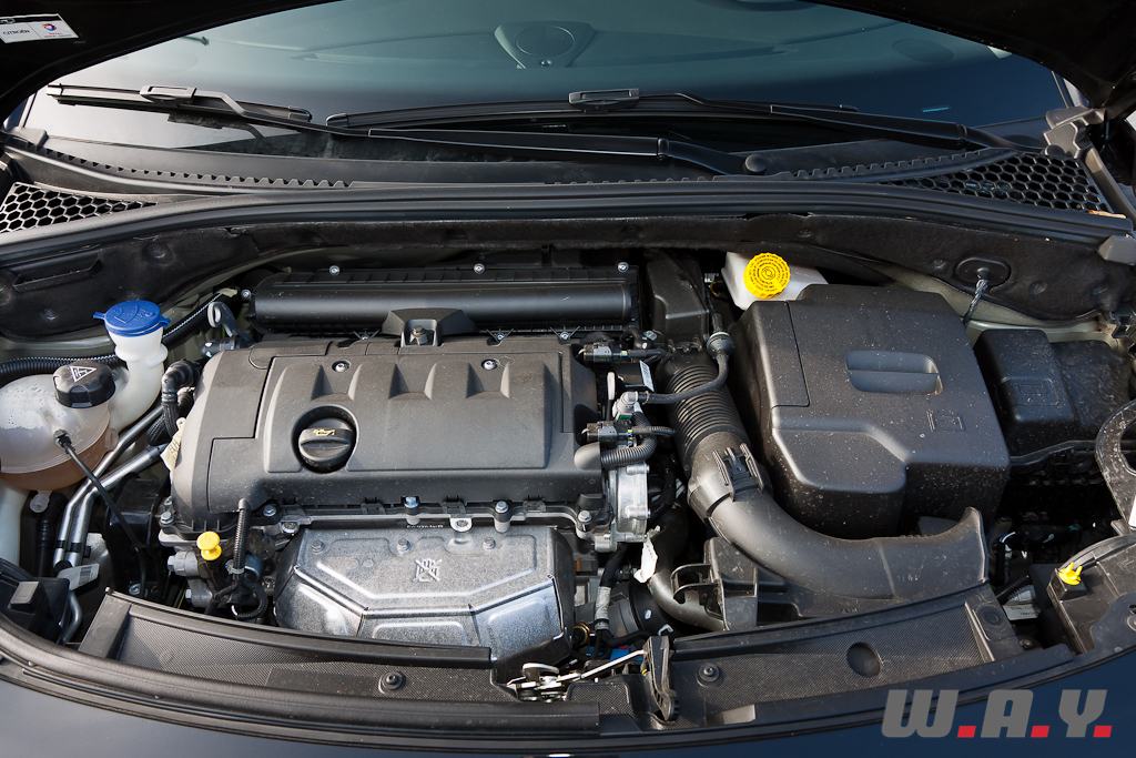 Contact. Le moteur 1.6 essence VTi (Variable valve lift and Timing Injection, soit calage variable des arbre à cames d’admission et d’échappement) de 120 CV est tellement silencieux au ralenti que je me suis souvent demandé si la voiture n’était pas équipée du système “start and go”. Rien à voir avec les versions diesel qui certes consommeront un peu moins, disposeront de plus couple mais sans la qualité acoustique qu’offre ce moteur essence. C’est un moulin bien rond qui donne l’impression d’avoir plus de 156 Nm mais qui n’aime pas forcément monter vite et haut dans les tours. Il faut passer la barre des 4’000 tr/min pour qu’il daigne se réveiller. On sent qu’il n’est pas “calibré” comme dans une version plus typée comme la DS3. Pour sa défense, la voiture était quasi neuve et même aujourd’hui où l’on nous rabâche que le rodage est presque superflu, nous savons qu’il faut laisser un peu de temps pour qu’un moteur trouve sa “plénitude”. Alors même si Citroën ne suit pas encore la tendance du downsizing en adoptant par exemple un “petit” 1.2 ou 1.4 suralimenté pour ses versions “puissantes” ce 1.6 est plaisant et en parfaite adéquation avec la vocation première de cette voiture. Le “truc écolo” et agaçant : à peine aurez-vous atteints les 2’100 tr/min qu’un indicateur logé dans le troisième cadran sur la droite du combiné vous indiquera de passer le rapport supérieur. Le sélecteur de la boîte de vitesses qui comprend cinq rapports plus la marche arrière, est précis mais pour moi le débattement est long. Néanmoins le guidage est parfait et la boîte est relativement bien étagée.