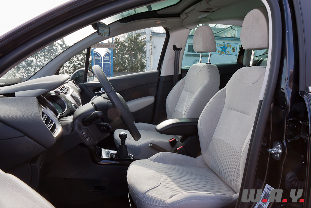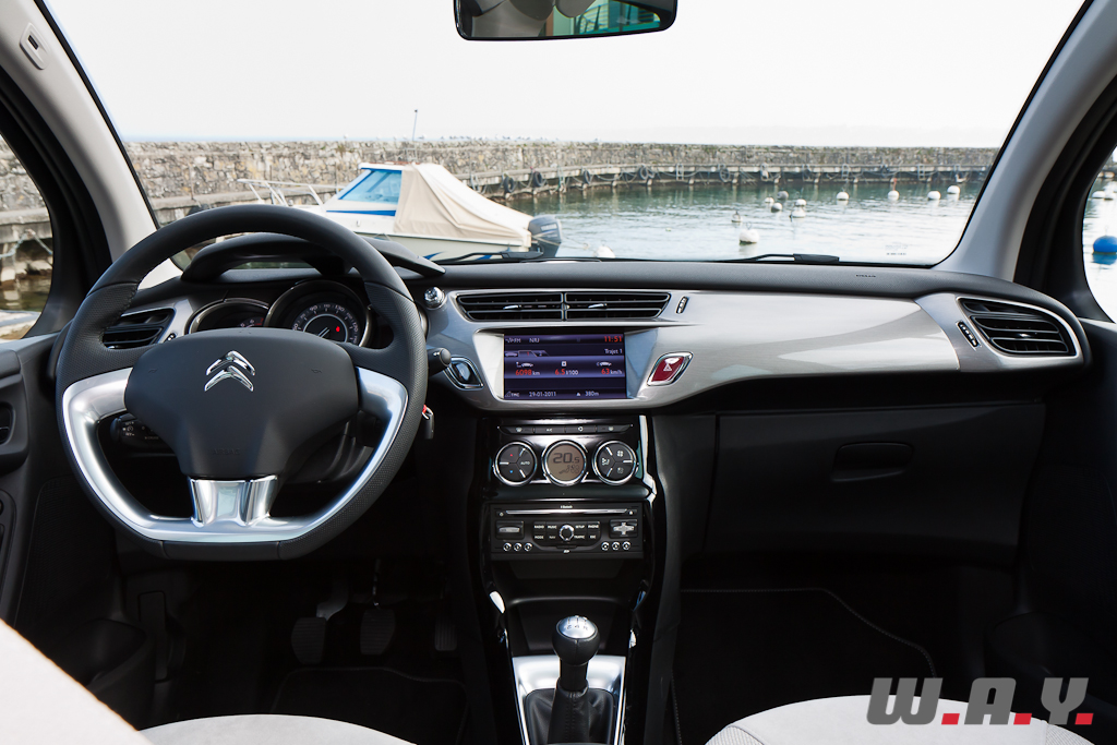 L’ensemble châssis/amortissement offre un confort remarquable. On se sent comme dans une voiture de catégorie supérieure ayant un empattement plus long. Là, encore Citroën a privilégié le confort au sport mais n’oublions pas qu’il s’agit de la version familiale et que si vous voulez une version typée plus sport il faudra vous tourner une fois encore vers la DS3. La direction trop assistée est molle, presque caoutchouteuse et avare en retour, ce qui ne permet pas, là encore, une conduite très dynamique. En revanche, c’est une direction très plaisante en ville ou elle se fait oublier et facilite grandement la réalisation d’un créneau ou autre manœuvre. J’ai beaucoup aimé le freinage très franc et au mordant direct sans pour autant être brutal comme sur certaines voitures. Aidé par un ABS, un AFU (Assistance au Freinage d’Urgence) et un REF (Répartiteur Électronique de Freinage), il permet de freiner court et pourtant la neige étant annoncée, j’étais équipé de pneus hiver fraichement montés pour l’occasion. J’ai eu l’occasion, à 1’650 mètres d’altitude, de rouler sur un parking recouvert d’une bonne couche de neige glacée et la voiture, de par son équilibre et étant bien chaussée, s’est comportée à merveille. Côté consommation, nous avons relevé un 6,9 l./100 km de moyenne sur les 1’200 kilomètres parcourus avec un parcours mixte ville, cols et autoroute, ce qui, sans être excellent, reste raisonnable. Même si elle est encore assez lente, la boîte de vitesses BMP (boîte séquentielle pilotée à six rapports) ferait merveille dans cette voiture. Certes, le poids se verrait en légère augmentation mais le moteur a encore de la réserve pour palier à cela.