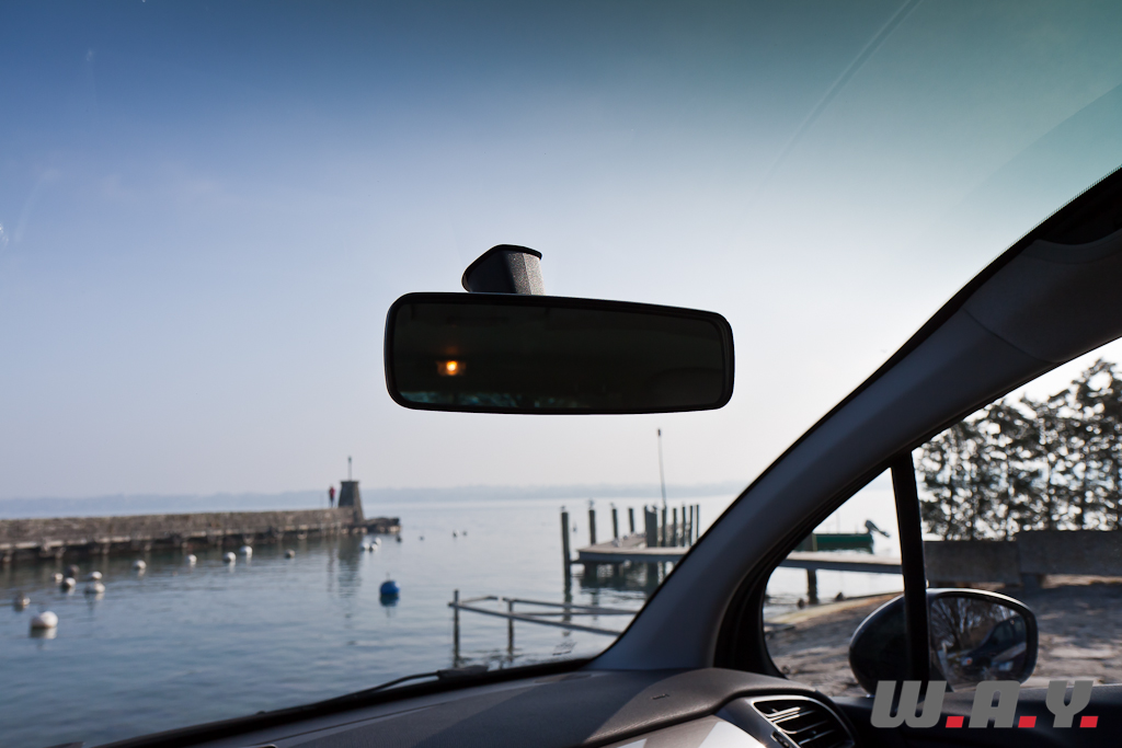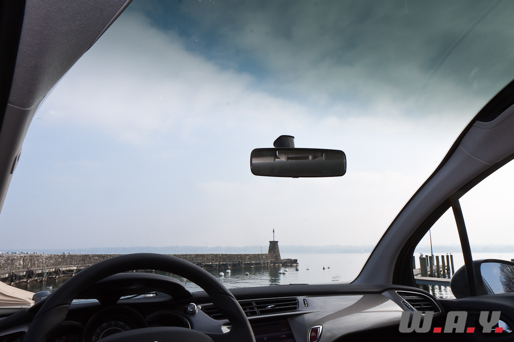 A l’ouverture de la porte côté conducteur, on découvre à bonne hauteur un intérieur vaste, des sièges avant bien dessinés et confortables avec ce qu’il faut comme réglages pour trouver sa juste position. Le combiné de l’instrumentation est placé avec justesse sous les yeux. Ergonomique, le poste de conduite est bien pensé, tout tombe sous la main ou les doigts. Des clignotants aux réglages de la radio en passant par les essuie-glaces et le limiteur de vitesse, tout est intuitif. Le GPS est logé en haut dans la console centrale. Bien intégré esthétiquement, il demandera néanmoins au regard de se baisser et donc de quitter la route des yeux plus longtemps. Il est d’un maniement simple et convivial. Cet écran intègre aussi la radio et nombre d’autres informations telles que la température extérieure, le radar de recul et même l’altitude. Par contre, je n’ai jamais pu éteindre cet écran ; ayant horreur d’avoir trop de choses éclairées dans l’habitacle pour conduire de nuit, je n’ai réussi qu’à choisir une couleur de fond plus douce et baisser la luminosité au maximum. Entre les deux sièges avant, un fin accoudoir central avec rangement peut se lever si on désire plus de place aux coudes. Côté passager, la découpe en partie basse du tableau de bord au niveau de la boite à gants, qui reste malgré tout très profonde, offre le loisir de s’installer sans se cogner et profiter de l’espace au jambes généreux. Les matériaux recouvrant le tableau de bord sont agréables à l’œil et au toucher. La finition n’égale pas celle de certaines marques allemandes à cause de quelques plastiques un peu durs, mais l’ensemble est agréable à l’œil et en net progrès. Il est à regretter un peu trop d’inserts couleur acier donnant une touche trop sport pour un style voulu résolument chic. La poignée de maintien logée dans la portière est en finition acier et de ce fait froide au toucher ce qui, en hiver, est fort désagréable et ne correspond pas au “standing”. En termes d’équipement, la finition inclut le radar de recul aidant grandement pour manœuvrer, une radio/CD hifi système de qualité avec possibilité de connecter un MP3 via une prise jack, le célèbre parfumeur d’ambiance, une prise 12 volts, pas de roue de secours mais une bombe anti-crevaison. En tant que constructeur novateur, Citroën se devait de présenter quelque chose d’exceptionnel à sa nouvelle C3. C’est chose faite avec l’option pare-brise « Zénith ». Offrant une luminosité sans égale et un plaisir pour l’œil rare dans cette catégorie de voiture, ce pare-brise s’étire plus loin qu’à l’accoutumée vers l’arrière. Il s’agit bien d’une sensation nouvelle offrant un champ de vision vers l’avant augmenté de 80° par rapport à un pare-brise classique. Il reste la possibilité d’occulter ce haut de pare-brise mais dans ce cas-là, les pare-soleil ne sont pas ergonomiques – forme recourbée assez étrange qui ne suit pas le profil du toit – et ne peuvent se placer par rotation sur les côtés. Il n’y a ni miroir de courtoisie ni plafonnier central. Si vous optez pour un toit “normal” les pare-soleil seront présents et de forme classique. Les avis divergent sur ce pare-brise. La conception est fabuleuse avec le haut sur-teinté pour protéger des UV mais que ce soit pour le conducteur ou pour le passager, la sensation est étrange, certainement liée à la forme courbée du verre. On se retrouve avec l’impression de ne pas être en sécurité. Rien à voir avec un toit en verre comme sur une Porsche Targa ou autres Smart Passion. Là, dans le champ de vision il manque la traverse du haut du pare brise. Sensé créer une sensation d’accélération même à faible vitesse, c’est plaisant la nuit mais troublant le jour. A essayer avant de l’adopter. A l’arrière, nous avons de vraies belles places confortables avec une garde au toit très appréciable pour une petite voiture. La place pour les jambes est correcte !