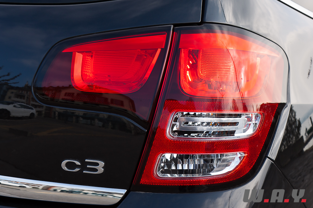 Première impression de l’extérieur, la voiture ne semble pas faire sa taille, 3.94 m. exactement. Est-ce dû à ce logo si imposant ? Il n’en demeure pas moins que la C3 reste la plus petite voiture de sa catégorie comparativement aux Peugeot 207, Renault Clio, etc. Sa forme en goutte d’eau plus allongée a gagné en dynamisme, plus rien à voir avec l’ancienne version qui semblait très haute et surtout trop ronde. Les feux avant redessinés, sa calandre très aérée, ses formes – un mélange subtile de traits arrondis et étirés – apportent cette sensation de douceur avec juste ce qu’il faut de dynamisme. La forme des rétros résume assez bien l’ensemble de la voiture. Même l’arrière s’est modernisé et s’inscrit dans les tendances actuelles. Ici en version haut de gamme “Exclusive” dans cette livrée noir verni associée à des baguettes, poignées et sortie d’échappement chromées, elle revêt une certaine élégance. Les jantes au design moderne contribuent à ce rajeunissement. L’équipe de design a réalisé un bon travail, faisant de cette C3, extérieurement, une citadine quasi “premium”, tâche incombant officiellement à la DS3 chez Citroën.