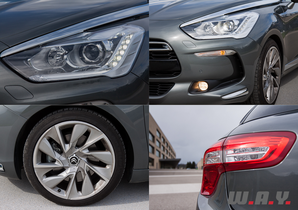 Oui, l’adjectif « belle » utilisé est purement un goût personnel, mais il faut reconnaître que cette nouvelle Citroën DS5 dégage quelque chose d’assez spécial. D’ailleurs tout au long de mon essai, j’ai été surpris d’entendre à multiples reprises des commentaires positifs à son égard et plusieurs personnes, certes souvent des conducteurs de Citroën, sont venues m’interpeller pour me poser des questions. Donc esthétiquement réussie ou simplement différente, cette DS5 ne laisse pas indifférent. Tiens d’ailleurs, encore un petit avis personnel, si la gamme DS n’a aucun lien de parenté avec la mythique voiture du même nom, la DS5 pourrait tout à fait en être la réinterprétation moderne. Mais encore fois, cela ne tient qu’à moi. Revenons sur la ligne, à mi-chemin entre un break et une berline avec hayon, elle s’affiche fièrement avec un air de concept-car. Ce qui est bien logique puisque elle s’inspire directement du concept C SportLounge présenté en 2005. Je dirais même que ce dernier était un peu plus sage, la face avant moins agressive et l’ensemble plus en rondeur. Pour la DS5, la calandre chromée avec les doubles chevrons, surmontée du logo DS, montre clairement son affiliation à la gamme Premium du constructeur. Sous les phares acérés soulignés de la signature LED, les arches intégrant les clignotants et les anti-brouillard me font penser à un requin, accentuant le caractère affirmé de la voiture. Le capot nervuré, relativement court, est orné de chaque coté par un bandeau, appelé « sabre » par le constructeur, qui relie l’optique avant au montant de pare-brise. En détaillant ces attributs, chromés sur cette version Sport Chic, je reste un peu septique mais combiné à l’ensemble de la voiture ils lui donnent encore plus d’élégance, surtout avec la teinte grise Galena de notre véhicule d’essai, tout en lui conférant une impression de longueur très importante. Son toit relativement bas avec une ligne fuyante tel celui d’un coupé et une largeur assez imposante ajoute à cette impression de grandeur. Les ailes arrière galbées, les belles jantes 19″ de série sur le modèle essayé et le petit béquet de toit apportent une touche de sportivité qui se retrouve aussi dans le dessin des sorties d’échappement profilées avec le bas de caisse. Les feux arrière, aussi issus du concept C SportLounge, en forme de boomerang et avec une partie inférieure concave, sans être totalement aspirés comme sur la Ferrari FF, complètent la ligne dynamique de la DS5. La petite lunette arrière est la suite logique du sublime toit vitré dont la composition en multiple éléments donne une image futuriste qui convient parfaitement à la DS5. Je m’attarde encore sur la voiture et en y réfléchissant encore et encore c’est peut-être dans la catégorie coupé quatre portes qu’il faudrait classer cette DS5 à l’image d’une Mercedes CLS envers qui la française n’a pas à rougir tant son dessin est somptueux.