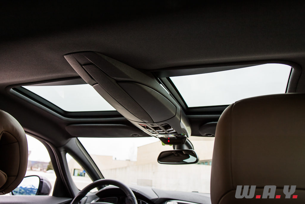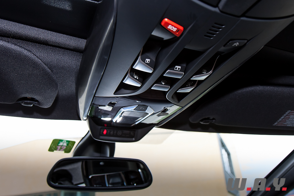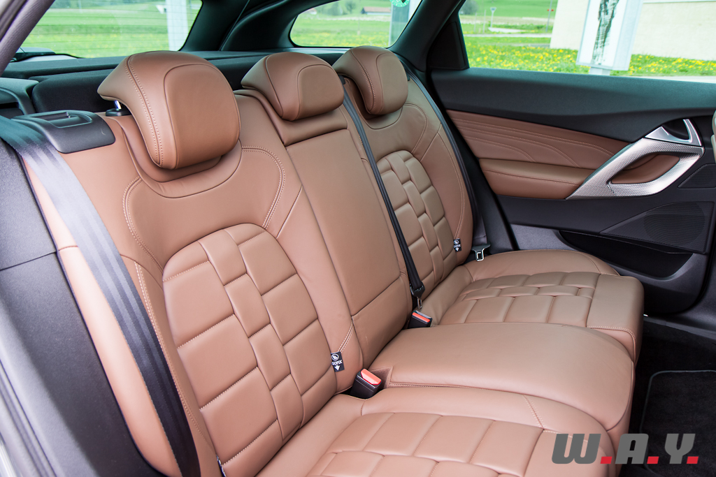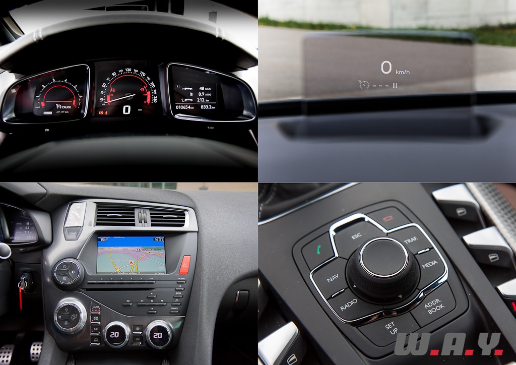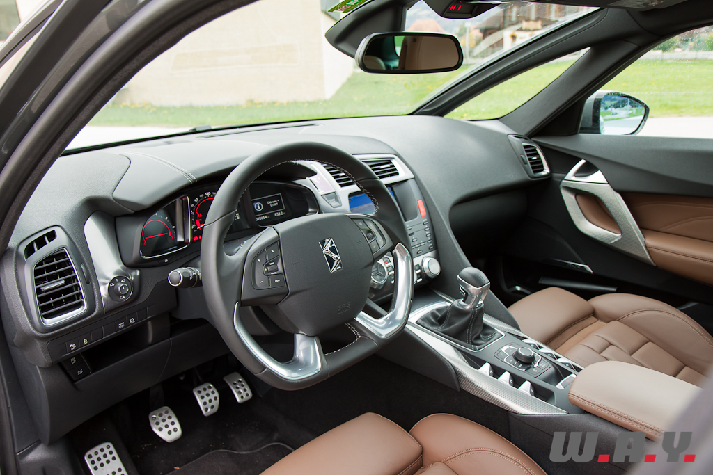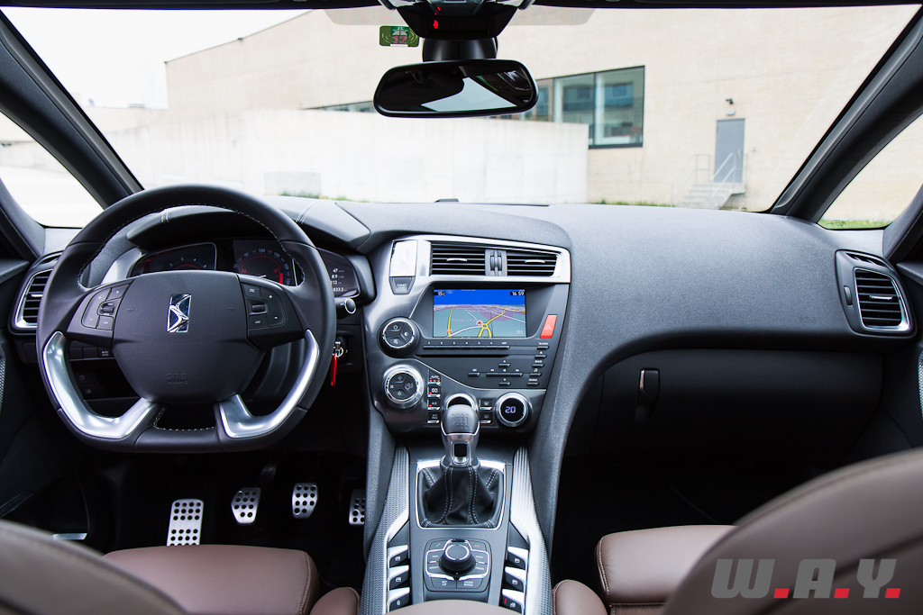 Raffinement et originalité se retrouvent aussi à bord de la DS5. La porte à peine ouverte, je découvre les magnifiques sièges en cuir Club de couleur Fauve dont la finition « bracelet de montre » est du plus bel effet. En plus d’être plaisant à l’oeil, ils sont très confortables avec une assise réglable à souhait et même une fonction massage pour le conducteur. Les touches d’aluminium mat se marient parfaitement avec celles bouchonnées de la partie centrale et les différents matériaux utilisés, tous de très bonne facture. Le volant à méplat offre une bonne prise en mains, les compteurs aux formes seventies combinés avec un rendu moderne et un affichage tête haute venant se loger dans la casquette de tableau de bord créent une ambiance alliant tradition et innovation. La console centrale s’inspire de celle d’un avion avec une partie inférieure dont les différents boutons commandent tout ce qui se trouve en-dessous de la ligne du tableau de bord et une partie haute, très fuselée et située dans le plafond, qui intègre les commandes des éléments supérieurs du cockpit. Bien installé au poste de pilotage, on se sent comme un pilote de ligne annonçant à ses passagers de boucler leur ceinture et leur souhaitant un agréable voyage à bord du vol DS5. Et il le sera à coup sûr car aussi bien pour le commandant que pour ses passagers tout est fait pour offrir un confort maximum. Les places arrière permettent d’accueillir sans peine trois adultes et le coffre offre suffisamment de contenance pour les bagages de chacun. Nous retrouvons aussi toutes les dernières technologies en termes d’équipements, soit le GPS avec vision 3D, une sono HiFi Denon (en option), le téléphone Bluetooth, la caméra de recul, etc. Le ciel de toit vitré offre une luminosité à bord très agréable. Ce dernier est composé de trois parties disposant chacune d’un store électrique qui se ferme de manière indépendante. La vie à bord, agrémentée d’un éclairage d’ambiance, est vraiment cossue, très luxueuse, tout en ayant un air légèrement futuriste comme la ligne de la voiture en fait, à croire que nous sommes installés dans la première classe dans un vaisseau spatial.