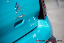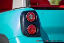 Le dessin de la E-Mehari ne laisse personne indifférent. Les formes rebondies rappellent la Cactus, mais là, la carrosserie est toute en plastique. Les pare-chocs semblent bruts de décoffrage, alors que les autres panneaux sont finis en brillant. Les feux de jour très fins devenu l’identité de la marque aux chevrons sont placés à la limite avec le capot posé à la façon des Jeep Willys.