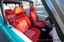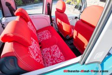 La rusticité mélangée aux couleurs chaudes de l’intérieur donnent le ton à cette petite auto fun qui respire les vacances. Les incontournables sièges en plastique étanches sont de la partie. Leur bruit si particulier quand on s’assoit dessus vous accompagne immanquablement dans tous vos déplacements. Les fonctions utilisateurs sont réduites au strict minimum : une ventilation avec climatisation en option occupe la colonne centrale, 6 boutons explicites sont placés juste en dessous, ainsi qu’une prise 12V et une connexion USB. Un espace est prévu pour un autoradio, mais il n’y en a aucun. C’est en fait votre smartphone via USB ou Bluetooth qui peut envoyer du son dans les haut-parleurs. Une commande Parrot plutôt pratique tient lieu de commande au volant.