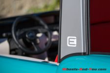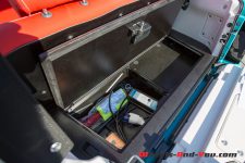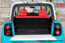 L’accès au coffre se fait par un hayon à basculer après avoir détaché les boutons pression de la capote. Pour un accès plus grand, il faut ouvrir les fermetures à glissière de la vitre arrière. La banquette est rabattable en une pièce pour emporter des objets plus volumineux qu’un sac de courses. Au fond de ce coffre se cache encore une trappe, celle-ci est en fait la seule partie verrouillable de la E-Mehari. Pour ne pas vous faire soutirer le câble de charge en stationnement, c’est là qu’il faut le ranger. Pour l’ouvrir comme pour autoriser le démarrage de la voiture, on présente le porte-clés de la voiture devant le lecteur de l’angle inférieur gauche du pare-brise.