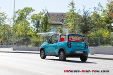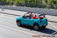 Ce qui fait l’intérêt de cette renaissance, ce sont toutes les parties amovibles pour en faire un cabriolet. Le toit se démonte en deux parties, les lucarnes arrière se soulèvent légèrement pour être retirées, la vitre arrière peut être roulée vers le haut ou totalement enlevée. Les fenêtres latérales s’enroulent aussi, mais le summum reste de retirer les panneaux entiers des portes. Malheureusement ceux-ci ne trouvent pas leur place dans la petite voiture à l’instar des autres parties, il faut donc les entreposer ailleurs.