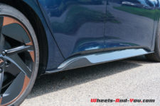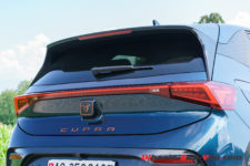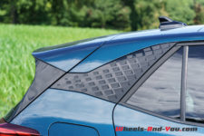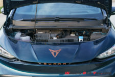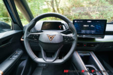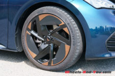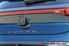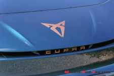Mon véhicule de test arbore la teinte métallisée Aurora Blue du lancement qui se marie bien avec les éléments couleur cuivre, la signature visuelle de Cupra. Le capot avant n’abrite pas de second coffre, il est entièrement dévolu à la régulation électrique et aux équipements de ventilation-climatisation. Les grandes roues Blizzard de 20″ sont en option, l’équipement de base prévoyant des roues de 18″.