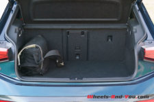 Malgré leurs surpiqûres cuivre, je trouve les sièges un peu austères dans leur teinte grise. Heureusement que les inserts cuivre rehaussent légèrement l’ensemble. Avec le capot très court et l’habitacle Cab forward, l’espace intérieur est véritablement spacieux pour une voiture de cette taille. Même siège du conducteur largement reculé, l’espace aux jambes des passagers arrière est généreux. Quant au coffre, avec un volume de 385 litres, il se situe dans la moyenne malgré la présence du moteur au-dessous.