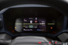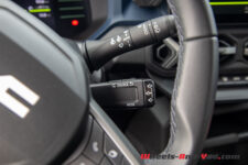 Le petit volant à la forme assez carrée me plaît bien : il est gainé de similicuir agréable, son diamètre convient à merveille et il transmet un bon ressenti de direction. Avec l’aide au maintien de trajectoire, j’étais satisfait jusqu’à prendre de longues courbes où la voiture, croyant que je ne tiens plus le volant, se met à bipper ; je n’ai d’autre choix que de supporter ça le temps de la courbe ou donner une impulsion suffisante au volant sans faire d’écart sur la route. Cette aide peut durablement être désactivée, ce qui n’est en revanche pas le cas de l’avertisseur de dépassement de vitesse, règlementation oblige.