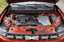 Sur la version Hybrid 140, on retrouve un moteur bien connu : un 4 cylindres en ligne 1.6 litres et 94 chevaux. Les moteurs électriques qui y sont associés (un moteur de traction de 49 ch et un générateur de démarrage à haute tension) procurent conjointement une puissance suffisante pour démarrer convenablement. Les deux propulseurs entraînent les roues au travers d’une boîte de vitesses automatique qui privilégie l’électrique. Il y a 4 rapports primaires et 2 secondaires, à l’instar de la Renault Megane E-Tech essayée en 2021. Au contraire de cette dernière, la Dacia n’est pas Plug-In ; on ne peut donc pas la brancher pour recharger la batterie.