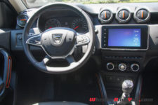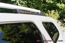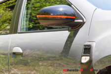 Pour notre essai, nous avons hérité d’une déclinaison en série limitée appelée “Extreme”. Ainsi, notre Duster se pare d’inserts décoratifs oranges. On retrouve cette teinte sur la grille avant, les coques de rétroviseur, les barres de toit avec les embouts avant en plastique noir et c’est le nom Duster qui est marqué en Orange, repris de la même couleur sur le hayon arrière.
