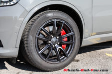 De profil, cela se gâte un peu lorsqu’on s’approche de l’arrière. Pour gagner du volume d’habitacle et lui faire gagner une 3ème rangée de sièges (contrairement aux deux rangées du Grand Cherokee) la chute du coffre se voit devenir un peu trop carrée à mon goût. On passe d’un avant ultra agressif à un trois-quart arrière un peu monospace, dommage. Heureusement qu’il y a les grosses jantes 20 pouces enfermant les imposants étriers de freins Brembo rouges pour ajouter un peu de piquant à sa ligne.