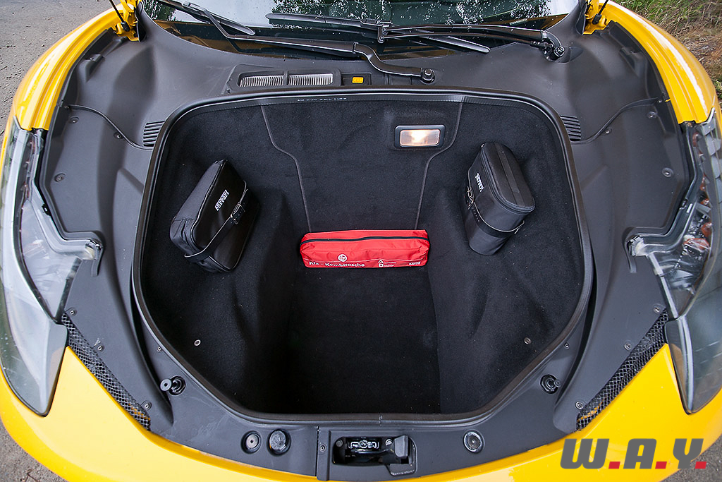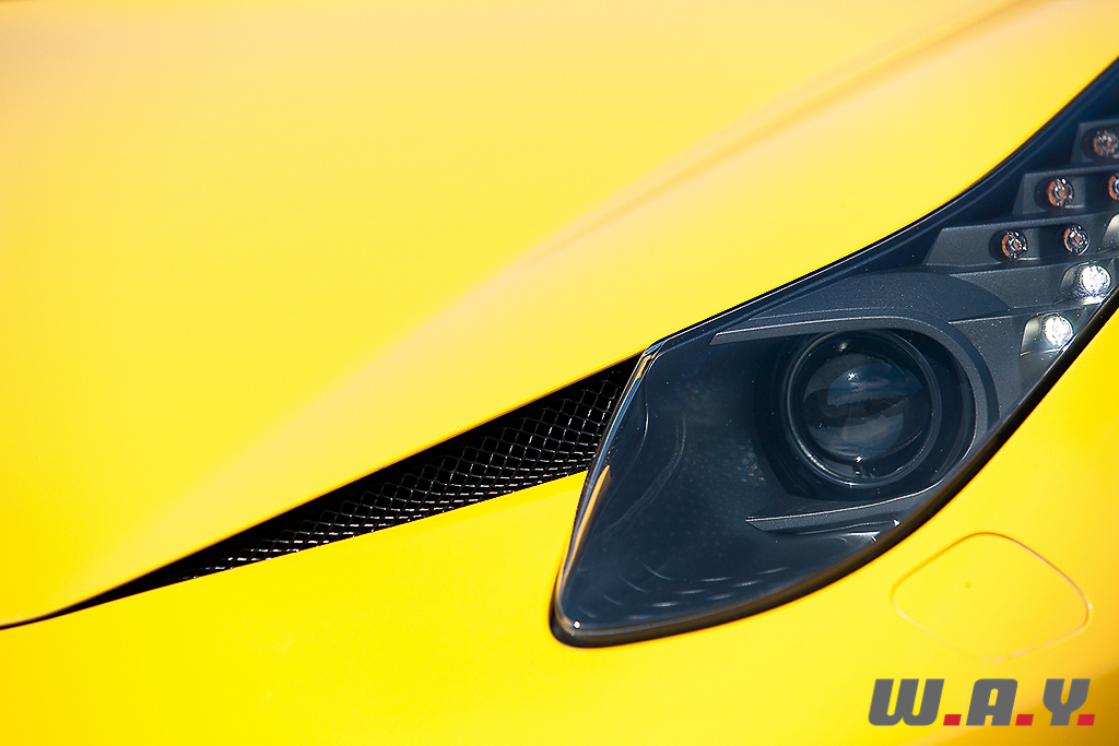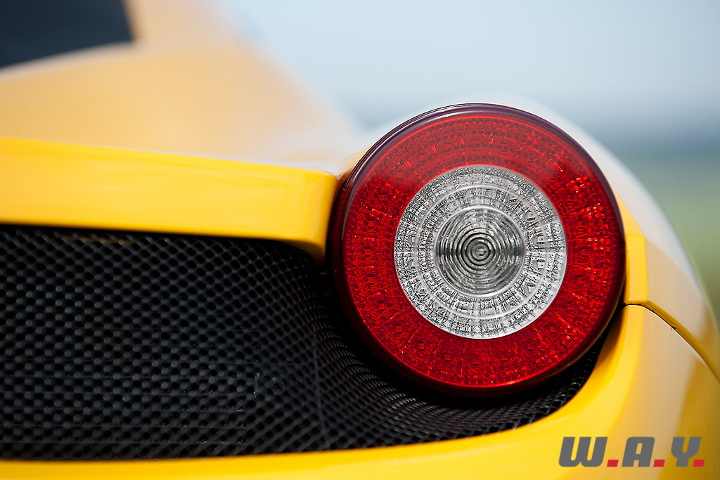 Si ses proportions sont quasi identiques à celles de la F430 à qui elle succède, l’empattement plus long et les porte-à-faux réduits rendent la 458 imposante. Même si son esthétique m’a quelque peu dérouté lors de sa présentation, je dois bien avouer être tombé sous son charme et ébloui par ce jaune Modena qui lui sied à merveille. Il y a très longtemps qu’une Ferrari ne m’avait pas autant intimidé.