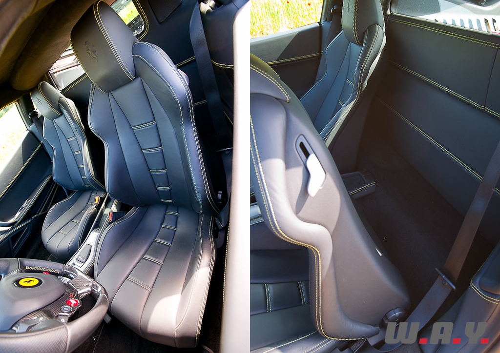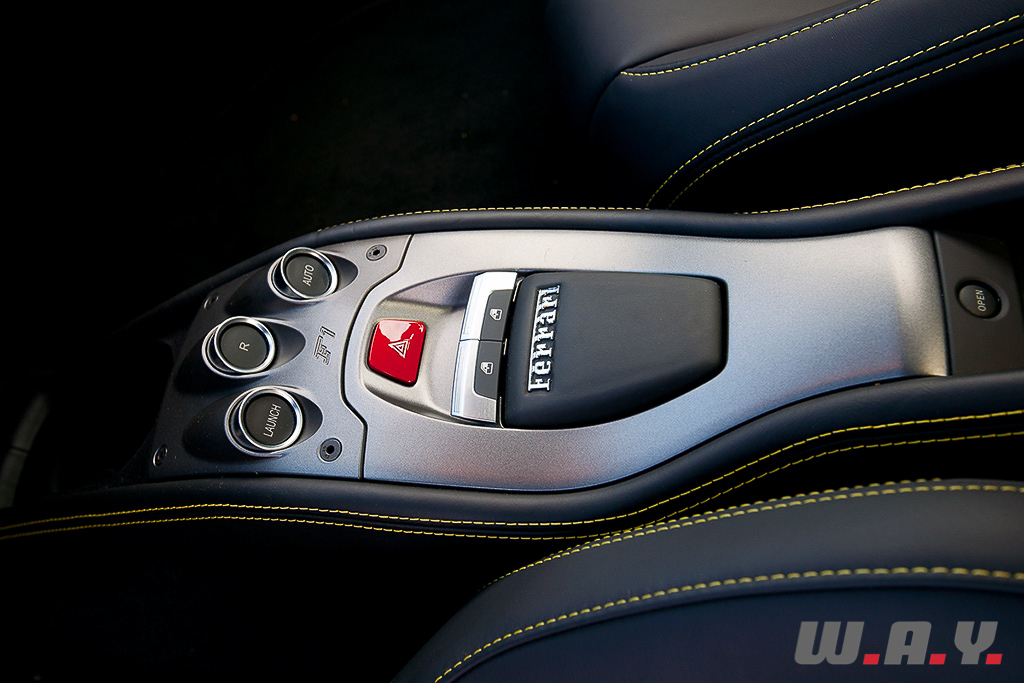 L’audace stylistique a également envahi l’habitacle. Puisant son inspiration dans la Formule 1, l’interface homme-machine se veut révolutionnaire et au plus près du pilote. Ainsi, le volant intègre le célèbre Manettino, forcément, mais également les commandes des clignotants, des phares, des essuie-glaces et des suspensions pilotées. Au sommet de la couronne s’affichent les diodes rouges en fonction du régime, vous indiquant de passer le rapport de vitesses supérieur. Si l’aspect intuitif de cette disposition n’est de loin pas une évidence, les automatismes à l’utilisation des clignotants, par exemple, s’acquièrent finalement assez vite ; même si en fin de journée, dans la circulation urbaine assez dense et nécessitant toute ma concentration, ma main gauche allait toutefois chercher un commodo de clignotants inexistant. La colonne de direction n’accueille plus que les palettes de changement de vitesses. La planche de bord adopte un design pour le moins torturé et futuriste, notamment avec les buses d’aérations entourant l’instrumentation. La finition frise une perfection à laquelle la marque ne nous avait guère habitués avec un habillage de l’habitacle en cuir surpiqué du plus bel effet et des ajustements quasi parfaits.