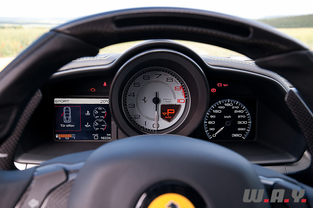 Petit coup d’œil sur le Manettino, je suis en mode « Sport », le mode par défaut de l’auto… Passons en « Race » ! Valves grandes ouvertes, l’échappement crie sa hargne à qui veut l’entendre, la sonorité envahit l’habitacle, un pur bonheur. Chaque rétrogradage est ponctué d’impressionnants coups de gaz et les borborygmes de l’échappement. La suspension se fait plus ferme et les rapports de boîte passent encore plus vite et sans ménagement. Les assistances électroniques vous laissent plus de latitude, en dérive notamment. Et pour les têtes brûlées qui ne sauraient être satisfaites d’un tel arsenal, deux autres modes permettent de totalement déconnecter les aides…