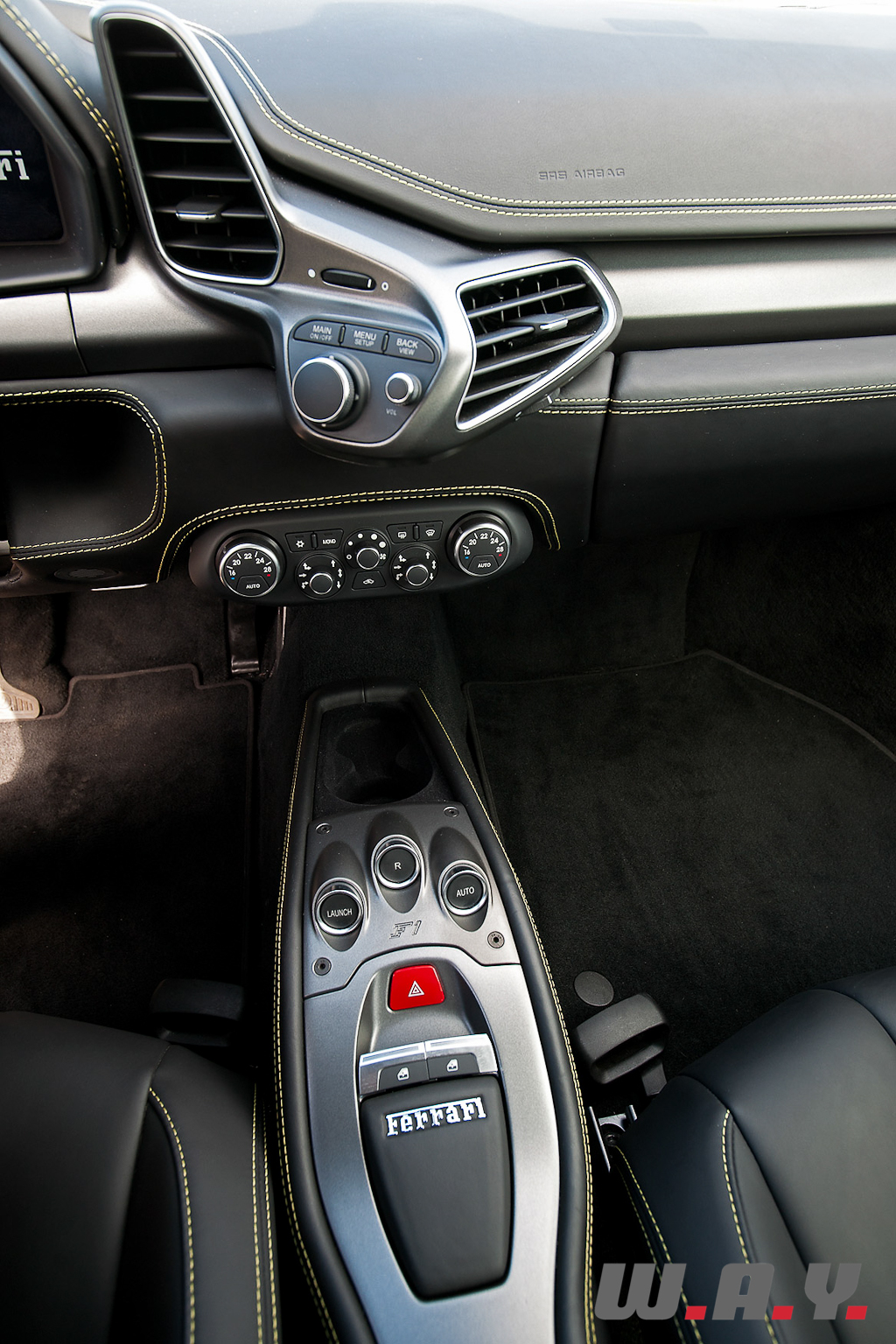 Face au conducteur, l’énorme compte-tours est le dernier témoin de l’ère analogique avec sa grosse aiguille. Pour le reste, Ferrari a opté pour une instrumentation électronique avec à droite un écran affichant au choix l’indicateur de la vitesse numérique ou imitant un traditionnel tachymètre ainsi que les données du GPS et à sa gauche un écran qui détaille les jauges diverses ainsi que l’ordinateur de bord résumant entre autres les réglages choisis via le Manettino. En outre, la 458 inaugure un nouveau logiciel d’assistance dynamique du véhicule (VDA). Grâce aux senseurs de pression des pneus, de la température d’eau et d’huile du moteur et du différentiel et ceux de l’ABS, ce programme est capable d’interpréter en temps réel l’état de santé de la mécanique, selon trois niveaux. Le premier, « Warm Up » prévient que les organes de l’auto ne sont pas encore arrivés à température. Le second, « Go », indique qu’ils ont atteint leur optimum de fonctionnement et que vous pouvez « taper dedans ». Enfin, « Over », vous prie instamment de mettre fin aux réjouissances afin de ménager votre monture.