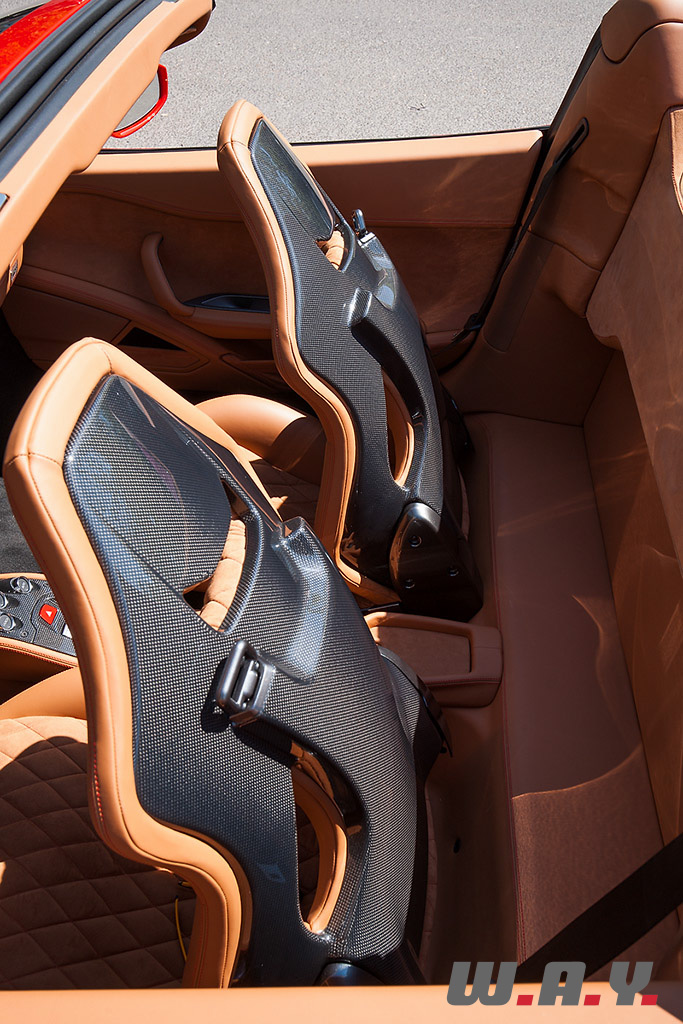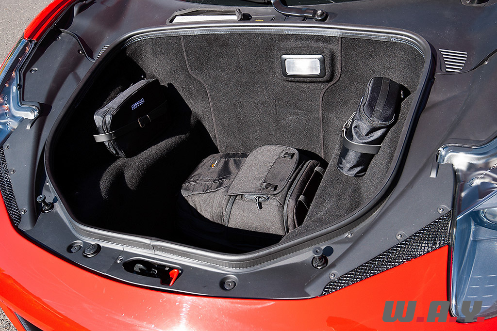 En entrant dans l’habitacle, nous sommes en terrain connu, repris du coupé. Rien n’a évolué si ce n’est deux boutons supplémentaires sur la console centrale, l’un servant à actionner le toit et l’autre la vitre arrière. On y retrouve les trois boutons de commande de la boîte de vitesses : automatique, marche arrière et “Launch Control” pour les démarrages assistés type course. L’ambiance est hyper sportive, avec le petit volant sport intégrant un “shift light” et les désormais habituelles commandes chez Ferrari, comme le démarreur, les indicateurs de direction, les interrupteurs de phares et d’essuie-glace, le sélecteur de modes de conduite, “Manettino”, ou encore un bouton permettant d’assouplir la suspension sur les mauvais revêtements. Tout droit inspiré de la compétition ! Le gros compte-tours jaune trône au centre du combiné d’instrumentation, avec de part à d’autre deux écrans multifonctions paramétrables à souhait. Celui de droite accueille également l’affichage du GPS quand ce dernier est enclenché. Alors que la sellerie du coupé Italia que nous avions essayé était noir sportif, notre Spider propose une magnifique sellerie “cuoio” plus cosy, avec surpiqûres en losanges sur les deux sièges baquets en carbone. Les sièges se rabattent pour dégager l’accès à un espace de rangement de 58 litres derrière eux. Sur notre modèle d’essai, les évents d’aération de la planche de bord sont également en carbone brillant. De petits vide-poches prennent place dans les portières alors que la boîte à gants demeure de taille restreinte. Malgré l’exiguïté de l’habitacle de cette stricte deux places, on s’y sent moins à l’étroit que dans le coupé, en particulier lorsque le toit est ouvert. Le coffre à bagages, situé sous le capot avant, propose un espace de 230 litres, soit un volume étonnant pour un véhicule de ce type. Il permettra allègrement d’envisager des séjours d’une semaine à deux. Il comprend également une trousse de premiers secours.
