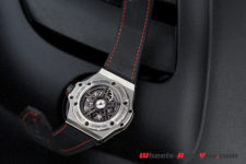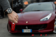 Je reviens un instant sur cet accessoire qui n’est pas directement au catalogue Ferrari, la sublime Hublot que je découvre en même temps que cette GTC4 Lusso T. En effet, quoi de mieux qu’un bel objet comme cette Big Bang Ferrari Titanium pour compléter l’équipement de cette voiture. Grâce à sa conception en titane, cette montre est très légère malgré un une taille plutôt conséquente de 45 mm. Une multitude de petits détails font le rappel avec les bolides de Maranello, notamment le fond de l’indication de date arborant du jaune, comme le compteur principal de l’auto, mais aussi des similitudes avec bien d’autres éléments. Sans compter le cheval cabré à six heures, le bracelet en alcantara avec surpiqûres rouge, etc. En finition Titanium, cette Big Bang Ferrari est éditée en 1’000 exemplaires uniquement pour un prix de CHF 24’900.-. Une somme vous en conviendrez, mais finalement un détail si vous craquez pour la Ferrari qui va avec.