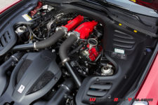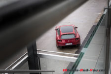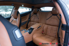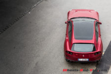 Notre voiture d’essai s’habille d’une robe « Rosso California » qui lui sied parfaitement. Pas trop tape-à-l’œil, ce rouge est quand même bien plus intéressant que du gris ou du noir, couleurs qui sont habituellement choisies pour ces modèles. Pour agrémenter son apparence, plusieurs attributs, tels que les ouïes latérales, la lame avant et les bas de caisse, sont eux en fibre de carbone. Là aussi c’est sublime, mais attention, ça fait grimper l’addition.