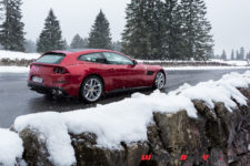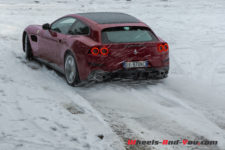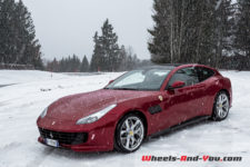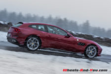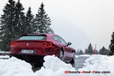 Le lendemain matin, à quatre dans la voiture, direction le col du Marchairuz. La neige a pointé le bout de son nez mais les routes sont dégagées. Les virages s’avalent à bon rythme et malgré une chaussée détrempée et froide, le comportement de cette GTC4 Lusso T est exemplaire. Certes, en sollicitant un peu trop généreusement l’accélérateur, l’arrière-train ne manque pas de rappeler que c’est lui qui mène le bal.