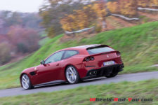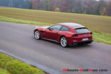 On redescend en plaine, la chaussée est maintenant sèche, de quoi découvrir tout le potentiel de cette super familiale. Le caractère démoniaque de l’auto se révèle, ça pousse très fort et les petites routes de la Côte vaudoise défilent vraiment très rapidement. L’amour à mon permis de conduire me rappelle vite à l’ordre. Le tempérament et le comportement routier confirment qu’il s’agit bien d’une véritable Ferrari et pas d’un simple break orné d’un prestigieux badge. Je n’en doutais pas vraiment depuis l’essai de la FF déjà, mais on peut constater que les ingénieurs de Maranello ont encore amélioré le produit. Cela notamment grâce aux quatre roues directrices (4WS) qui proposent une efficacité exceptionnelle en courbe.