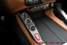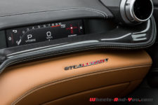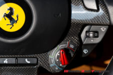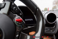 A bord, le carbone est également de mise, en option bien évidemment. Pour le passager, vous pouvez aussi opter pour un affichage digital placé au-dessus de la boite à gants. Ainsi, il ou elle peut disposer des informations sur la vitesse, le régime moteur, le rapport engagé, la position du « manettino », etc… C’est très sympa, mais attention, ça peut amener des controverses si Monsieur ou Madame ne tolère pas le rythme de conduite appliqué par celui ou celle qui se trouve au volant.