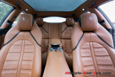 Une fois la porte conducteur ouverte, j’admire la sublime sellerie brune/beige, « Cuoio » pour être précis, qui recouvre la quasi-totalité de l’habitacle. Les sièges en finition Daytona sont vraiment superbes. Ce cuir tendu se veut chaleureux et accueillant. Ce n’est certes pas aussi rigoureux que dans une allemande, voire même dans une anglaise, mais on ressent immédiatement que cela a été fait à la main. A mes yeux, cela fait partie du charme d’une Ferrari, une petite touche artisanale dans un produit de haute performance.