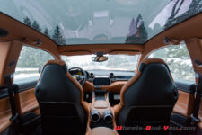 Rapidement mon regard est attiré par le sublime toit vitré et je profite de me glisser aux places arrière pour profiter encore un peu mieux de la vue vers le ciel. Le rendu est vraiment spectaculaire, c’est d’autant plus plaisant en traversant des forêts permettant ainsi de découvrir le sommet des arbres, qu’ils soient colorés par l’automne ou recouverts de neige une fois que j’atteins les hauteurs. L’espace à bord est vraiment remarquable. Malgré mon mètre quatre-vingts, je suis à l’aise à l’arrière alors que le siège conducteur est réglé pour ma taille. J’embarque des amis pour aller manger, nous voyageons à 4 sans peine dans un confort indéniable et surtout avec une ambiance unique alliant volupté et dynamisme. Tout cela bercé par les vocalises du V8. C’est enivrant au point de regretter que les trajets ne soient pas plus longs.