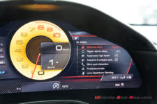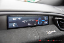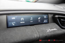 Et puis il y a aussi l’instrumentation à bord avec une pléthore d’écrans et je ne peux m’empêcher de penser au discours de Michael Leiters, CTO chez Ferrari, en 2017 à l’EPFL à l’occasion du lancement de la Portofino. A l’époque, la partie infotainment chez Ferrari était littéralement à la rue et il le reconnaissait en confessant que c’était un point où le constructeur devait s’améliorer et cette Roma apporte des nouveautés majeures sur ce plan. Par exemple, il est possible de modifier la disposition des informations à la volée et de modifier la couleur du compte-tours. Cependant, je ne suis pas totalement convaincu par l’interface digitale sur le volant pour accéder à une foule de menus et sous-menus. Ça demande probablement un peu plus de pratique mais ce n’est pas très intuitif et la partie digitale n’offre pas une expérience dénuée de défauts.
