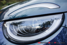 Les traditionnels quatre optiques sont aujourd’hui à LED en demi-rond, avec un design résolument moderne. Le haut du phare est intégré au capot et ressemble à un sourcil. La calandre est pourvue en son centre non pas du logo FIAT, mais d’un joli gros 500 stylisé. La calandre, dont la partie inférieure diminue ses entrées d’air comme sur toutes les voitures électriques, est formée d’une multitude de petits trous. Voilà enfin une voiture électrique qui reste plus belle à voir de face que sœur en version thermique. Le capot plongeant et nervuré en son centre renforce la ligne toute en rondeurs de cette 500.