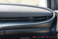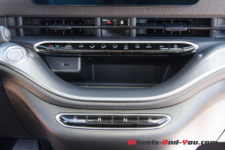 De plus, il n’y a plus de poignée de porte mais un magnifique petit bouton poussoir qui ouvre électriquement la porte. Une poignée « mécanique » un peu camouflée, placée en bas dans la porte, est là en cas de panne ou d’accident. On trouve aussi, ici et là, des petits rappels du lieu où est fabriquée cette 500. Une petite Fiat est même dessinée dans la contre-porte estampillée d’un « Made in Torino ». La ville de Turin est aussi représentée en stylisé dans le renfoncement dédié au chargement du téléphone. Pour finir, si vous doutiez encore dans quelle voiture vous êtes, un petit logo 500 se retrouve caché derrière l’écran tactile de 10,25 pouces. Ce dernier est d’ailleurs bien positionné et offre une vue sur toutes les commandes et infotainment très ergonomiques.