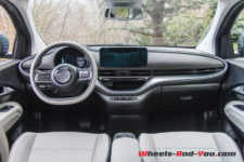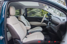 Avec une présentation qualitative de style néo rétro et son instrumentation digitale, cette nouvelle 500 électrique frappe juste. La planche de bord toute en rondeurs et en matériaux modernes (éco-cuir), intègre des boutons style touches de piano pour régler la climatisation et autres chauffages des sièges. Sur le bas de la planche de bord, qui forme comme une bouche entre-ouverte laissant la place pour poser et charger votre téléphone, se trouve une petite console de quatre boutons qui gèrent la « boite à vitesse ». Ainsi, point de levier, ce qui offre de la place pour différents rangements et donne à cet intérieur un aspect plus spacieux. Le volant, lui aussi en éco-cuir, est maintenant ajustable dans les deux sens.