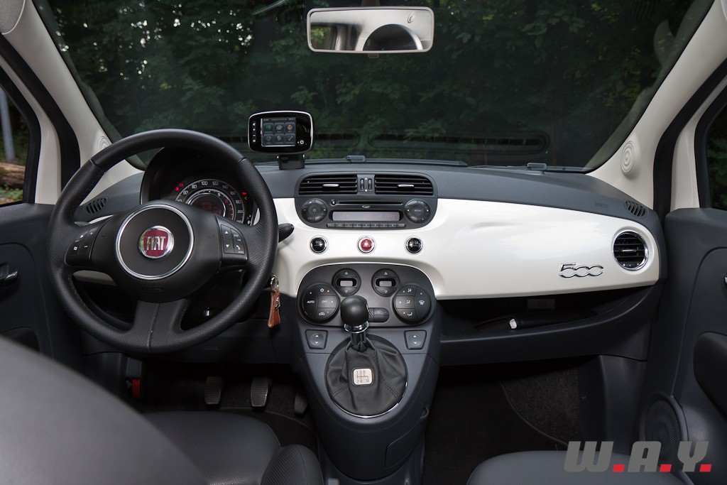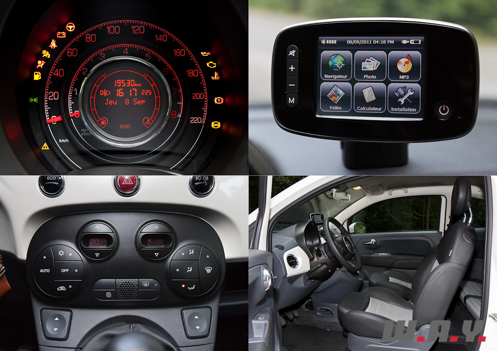 Même constat que pour l’extérieur. Instrumentation en cercles concentriques affichant en parallèle le compte-tours et le tachymètre, façade du tableau de bord couleur carrosserie, la source d’inspiration des architectes d’intérieur n’est pas à chercher bien loin. La 500 se fait séductrice à l’intérieur également avec une originalité et un petit côté « fashion » pas déplaisants. On notera toutefois une finition correcte, sans plus, des plastiques de qualité moyenne dont l’aspect, pour certains, mériterait d’être revu à l’aune des progrès réalisés par les concurrentes en cinq années. L’équipement est complet, bien que la climatisation soit en option sur le modèle de base (CHF 1’200.-), mais de série le constructeur nous propose une direction assistée « Dualdrive » asservie à la vitesse, l’ordinateur de bord et l’ensemble audio CD/MP3 avec ses haut-parleurs. Le GPS dont est doté notre modèle d’essai est un accessoire optionnel.