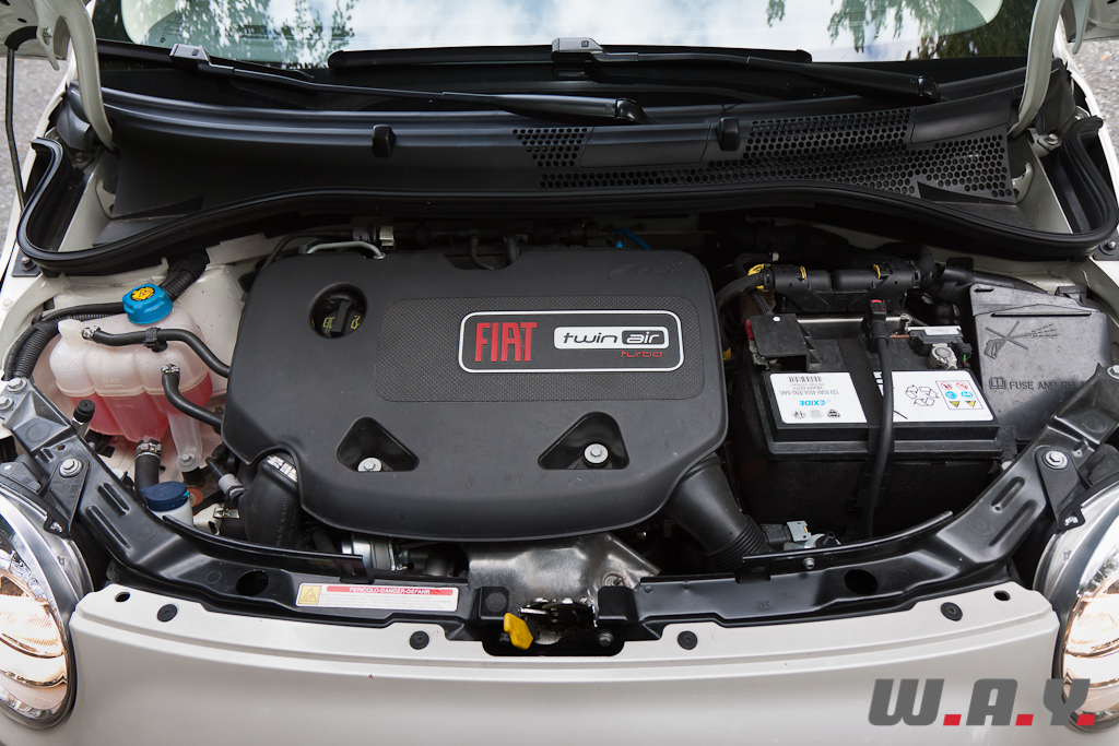 D’une cylindrée de 875 cm3 pour une puissance de 85 CV à 5’500 t/min et 145 Nm de couple à 3’000 t/min dont une très grande partie est disponible dès 1’900 t/min, nous avons là un rendement spécifique de voiture de sport, quasi 100 CV/litre, bien loin des 500 petits cm3 et 28 CV de son aïeule. Il se permet même d’afficher sur le papier des performances supérieures au quatre cylindres 1.2 litres, l’entrée de gamme du catalogue 500. Pour arriver à un tel résultat, Fiat a monté sur son “deux pattes” un turbo et appliqué, pour la distribution, la technologie Multiair qui optimise l’ouverture des soupapes d’admission pour une meilleure combustion. Confort d’utilisation oblige, les vibrations sont atténuées au moyen d’un arbre d’équilibrage supposé garantir un niveau de trépidations comparable à celui d’un quatre cylindres conventionnel. Supposé, oui, c’est le terme tant elles restent importantes au démarrage ou à bas régime, pour quasi disparaître une fois le régime de croisière atteint. Disponible, souple, vivant, ce moteur est sans conteste le plus amusant de la gamme.