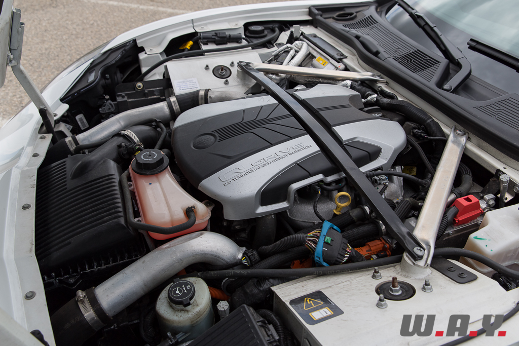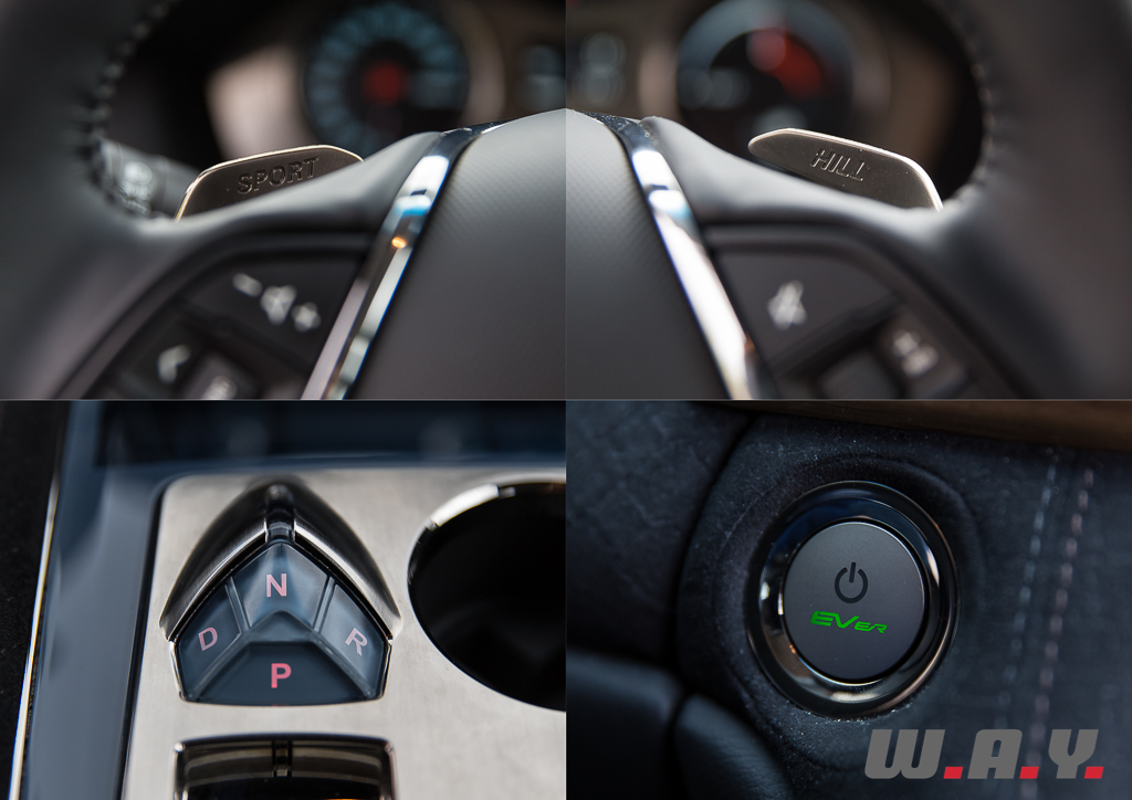 Sur la droite du volant, nous retrouvons une autre palette qui permet d’accentuer l’effet du frein moteur, enfin ce n’est pas vraiment le bon terme mais au moins vous le comprendrez, il s’agit en fait du réglage du récupérateur d’énergie. En mode « normal », la récupération d’énergie est faible, la voiture ralentie très peu au moment de lâcher l’accélérateur. En cliquant une fois sur cette palette (mode « 1 »), l’effet est accentué, puis une deuxième fois (mode « 2 »), le phénomène est encore plus présent. Le système s’appelle « Hill » et il trouve justement toute son utilité sur des routes vallonnées. Avec le mode « 2 », le plus présent, l’utilisation des freins est quasiment inutile sur des portions roulantes et son efficacité permet même d’effectuer le transfert de masse afin de placer l’auto en entrée de courbe. Pour parler brièvement des freins, ils sont à la hauteur des performances de la voiture. A l’avant des étriers 6 pistons avec des disques de 370 mm de diamètre et à l’arrière des 4 pistons avec des disques de 365 mm. Ça freine fort, c’est endurant, mais il n’en faut pas moins pour arrêter le mastodonte de presque 2,5 tonnes.