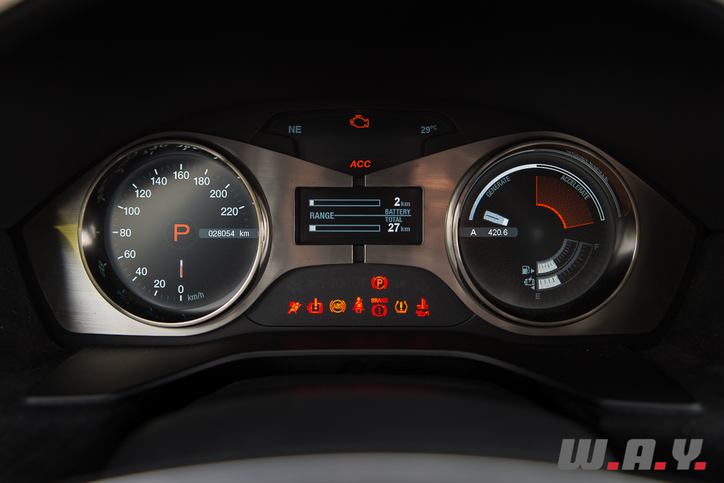 Alimentés par une batterie lithium-ion, rechargeable en environ 6 heures sur n’importe quelle prise 110 ou 220 volts, les moteurs électriques annoncent une autonomie maximum de 83 km en mode tout électrique, enfin selon la fiche technique de la voiture. Car en utilisation réelle, certes avec un style de conduite digne d’une petite sportive et de surcroit sur des routes vallonnées, j’aurai réussi à effectuer un peu plus de 53 km avant que le moteur essence ne s’enclenche. Il va de soi qu’en utilisation plus normale, je pense qu’il est facile de se rapprocher des données constructeur, mais je me devais de repousser un peu les limites afin d’évaluer la moins bonne performance. Toutefois, grâce au moteur thermique, le prolongateur d’autonomie « EVer » comme le nomme le constructeur, vous n’êtes plus limité à la seule capacité des batteries.