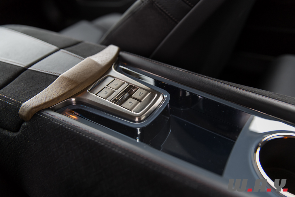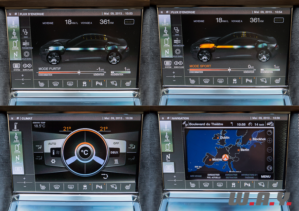Au centre du tableau de bord, un grand écran fait office d’interface avec l’ensemble multimédia qui équipe en toute logique une voiture de ce standing. Si ce dernier propose une très bonne présentation et des menus au design moderne et original, le fonctionnement est un peu en retrait des standards haut de gamme du moment. L’importateur m’a précisé qu’une mise à jour majeure était prévue pour le début de cette année mais du fait des quelques tourments qui animent la société actuellement, tout cela a été retardé. A l’exception de quelques lenteurs, rien de dramatique non plus, l’utilisation du système au travers de l’écran tactile est très intuitive. Nous y retrouvons tout le nécessaire, soit une bonne sono, un système Bluetooth pour le téléphone, un GPS et l’ordinateur de bord. Ce menu est celui que je préfère à bord d’une voiture électrique ou hybride. C’est devenu un jeu, en conduisant des véhicules équipés de ces technologies, de consommer le moins, de faire le plus de kilomètres en mode tout électrique, etc. Bon c’est avant tout mon côté geek qui est attiré par cet interface et non pas un quelconque penchant écologiste.