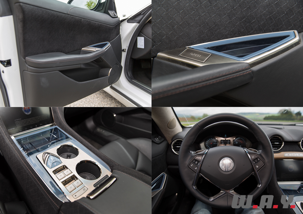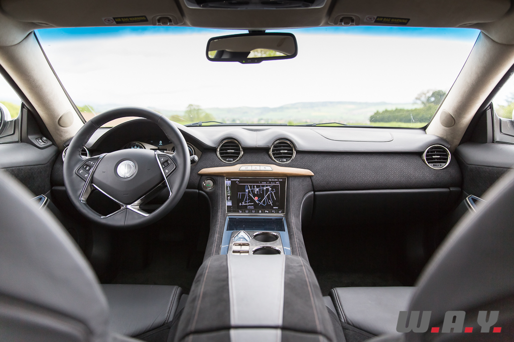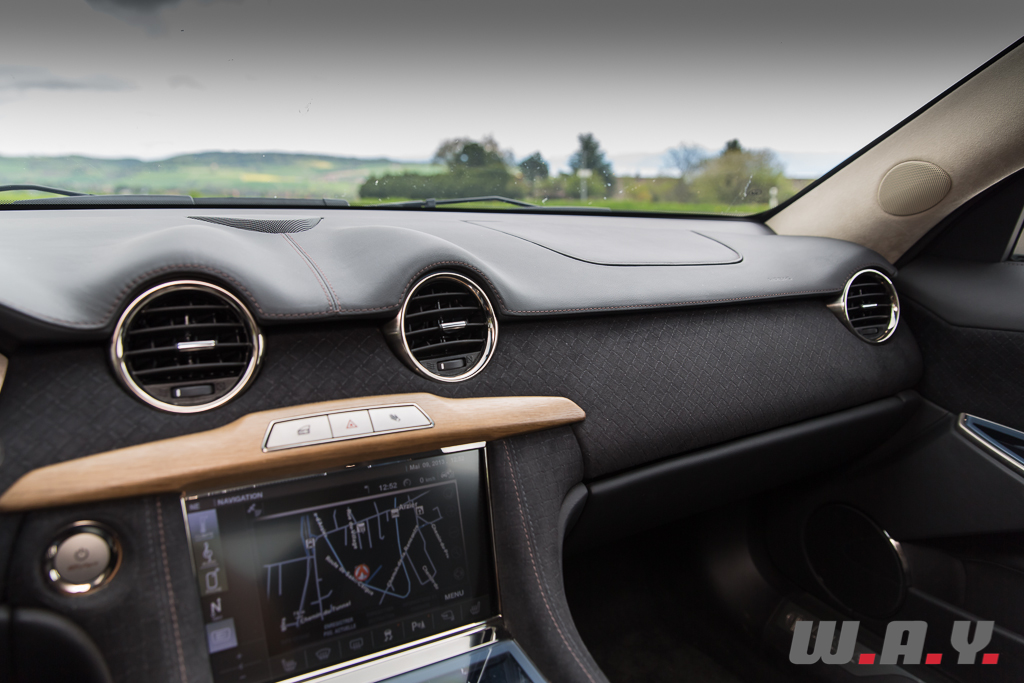 Je me glisse à bord de la bête et là encore l’impression de concept car saute aux yeux. Les matériaux utilisés, tels que le verre, l’aluminium, le bois et l’alcantara, ainsi que leur application confirment ce sentiment d’être à bord d’un prototype, voire d’une soucoupe volante, roulante en fait, tout droit sortie d’un film d’Hollywood.